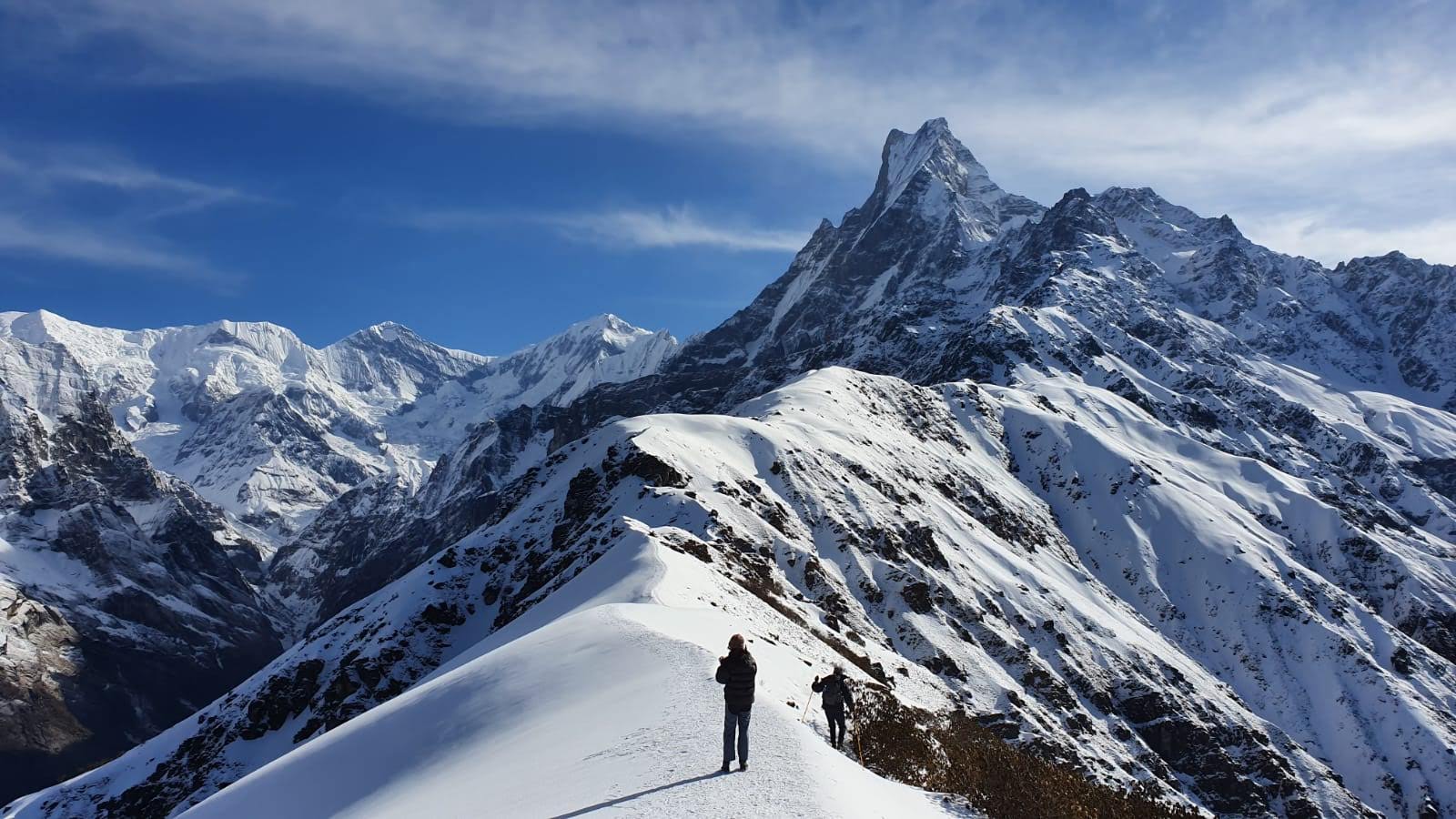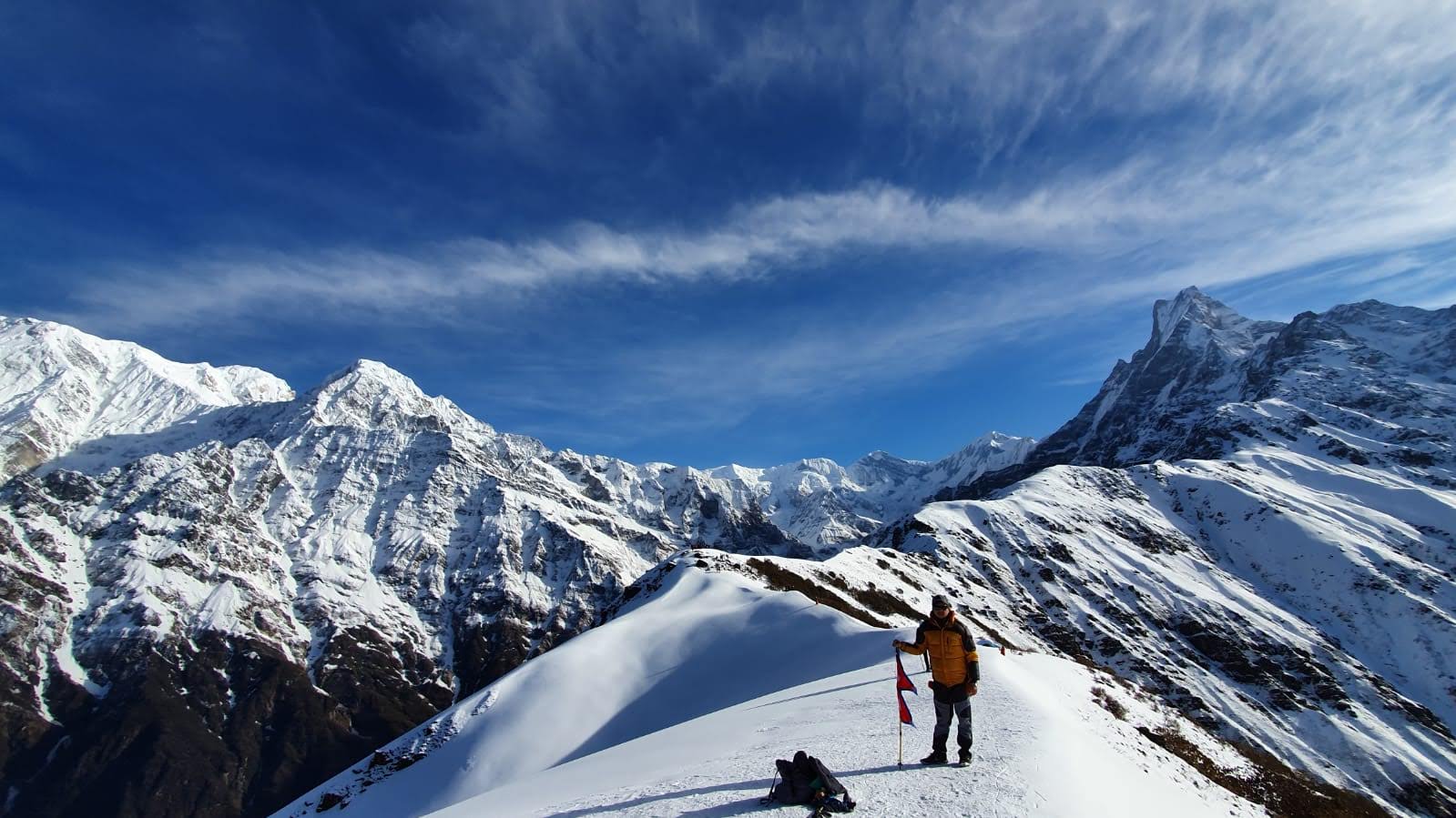 · Close-up views of Mardi Himal, Machhapuchhre (Fishtail), Hiunchuli, and the Annapurna range.